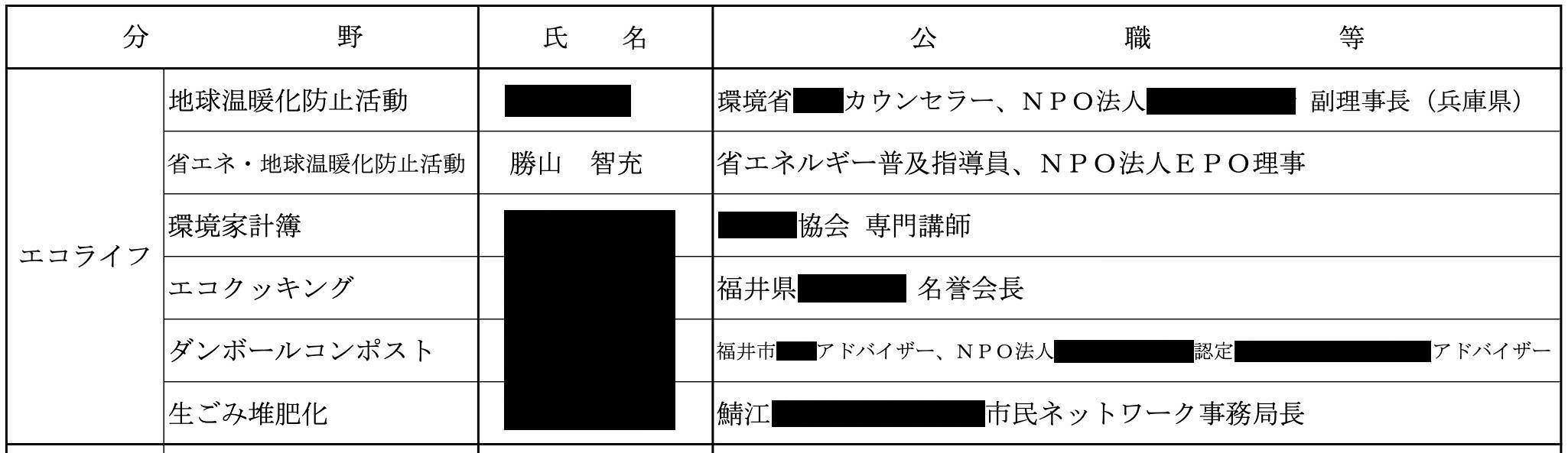 地球温暖化防止活動を担当したのは、オーストラリアにおける植樹活動が評価されたことによるものだろう。ただし、実際には勝山は現地の民間企業がお膳立てした植樹イベントに体験参加したことがあるだけのようである。そうした人物に環境アドバイザーとして何ができるのかは、かなり疑問と言わねばならない。福井県は利用者の声に耳を傾けることはなかったのだろうか? 8年も任用を続けた末に、逮捕を受けてようやく解任したのは、福井市が市民大学講座の講師を1期で解任したのと対照的である。もともと制度として機能していない証拠ではないだろうか。勝山を解任して誰か別な人に首をすげ替えて終わりでは、すまない話である。