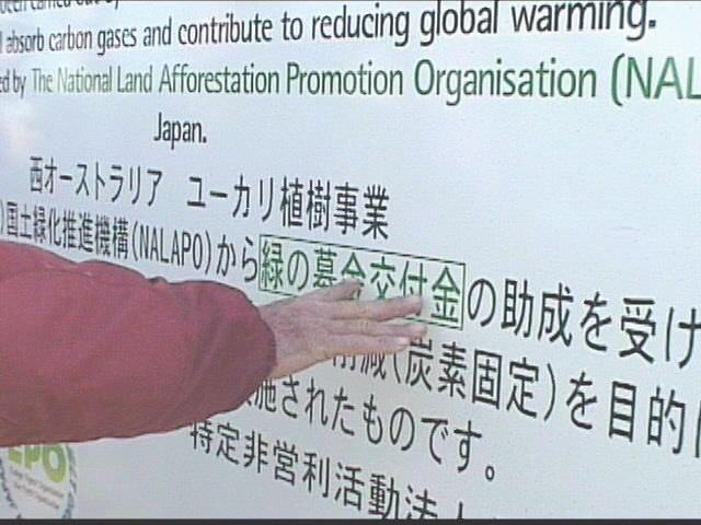 写真の撮影時期は2004年6月28日前後。撮影場所は撮影場所は西オーストラリア州レイクグレース郡ニュードゲート付近にあるウィルコック氏 (Terry and Dot Wilcock) の私有農地。写っている立看板に記された文章は日本語にも英語にも、やや、おかしいところがある。末尾には EPO のマークと並んで植樹会を実施した現地企業 OMC のマークが入っているのだが、この立看板を用意したのは OMC ではなく勝山であろう。なお、この時の記念写真の1枚が後に立派な証書に化けて NHK に取り上げられたようである。