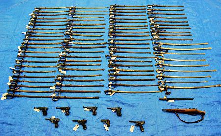 押収した小銃1丁、模造拳銃8丁、軍刀86本
