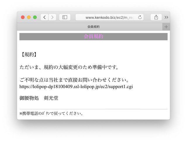 ようやく、この契約条項の削除が確認されたのは2019年3月20日のことである。削除の正確な日付は不明だが、確認された日から数日以内、せいぜいでも数週間以内だろう。なお、勝山剣光堂のウェブサイトには2019年1月10日付で「取引規約、会員規約、ご利用規約、各種約款の更新のお知らせ」という告知が出ているのだが、更新はされておらず、ただ単に全体が一括で削除されただけであることを見ても、この日付の信憑性には疑問が残る。